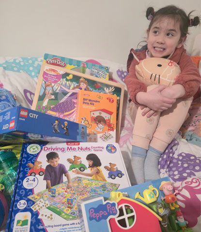 Cressida is five and lives with her sister Cecily aged 3, and her playful and friendly brother Tristan 7, who has autism. We are very busy keeping Tristan safe each day, so it was lovely for Cressida to have her own parcel of toys to play with, she gave the blue ball to Cecily, and has really enjoyed rotating through the other toys.